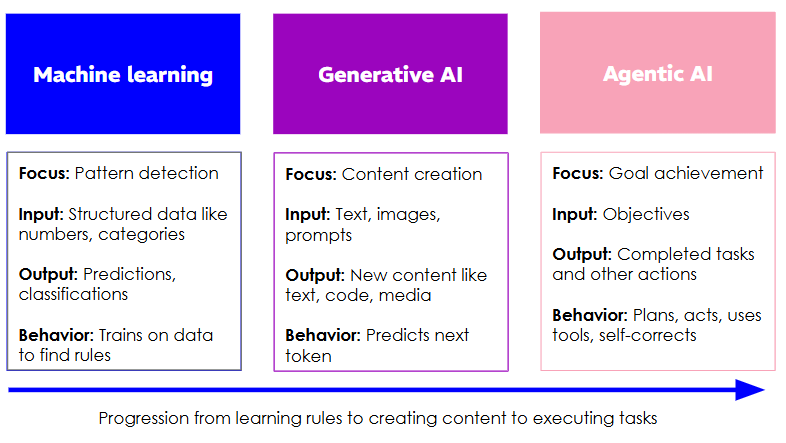I make a crude distinction between machine learning, generative AI and agentic AI, as show below.