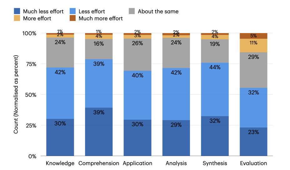 If we consider self-reports on how people feel (rather than brain activity), there are other reasons to be concerned. A study of 319 knowledge workers found clear evidence that they felt they were making much less cognitive effort when using ChatGPT than it was absent.
