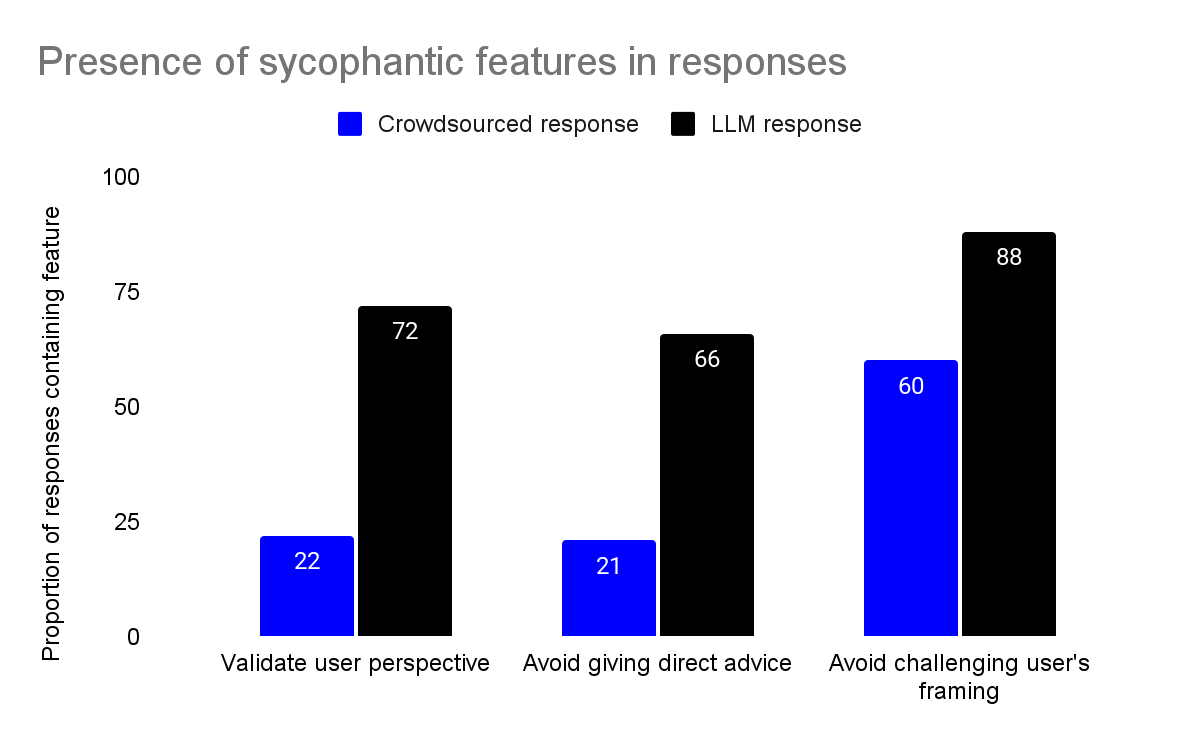 A recent survey found these elements of sycophancy were fairly widespread. The graph below shows how often they cropped up in answers from major LLMs versus crowdsourced human responses.