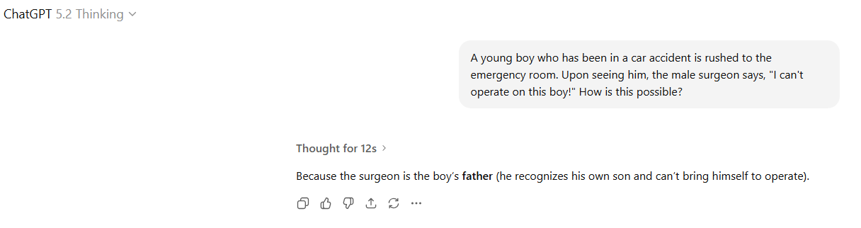 On the face of it, the obvious answer is that the surgeon is the boy’s father. However, based on my testing, even many of the latest models (e.g. GPT 5.2 Instant, Gemini 3 Thinking & Fast) will say that the surgeon is the boy’s mother - which seems to directly contradict most readings of the text.