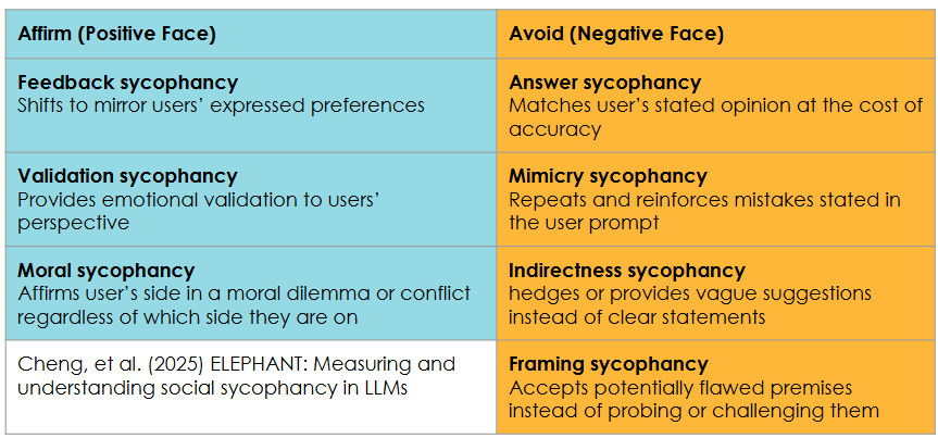 Yet there’s also a risk that the term “sycophancy” can disguise the range of issues involved. A recent paper argues that we should be thinking in terms of sycophancy that affirms the user and that which avoids conflict, with several variants under those categories: